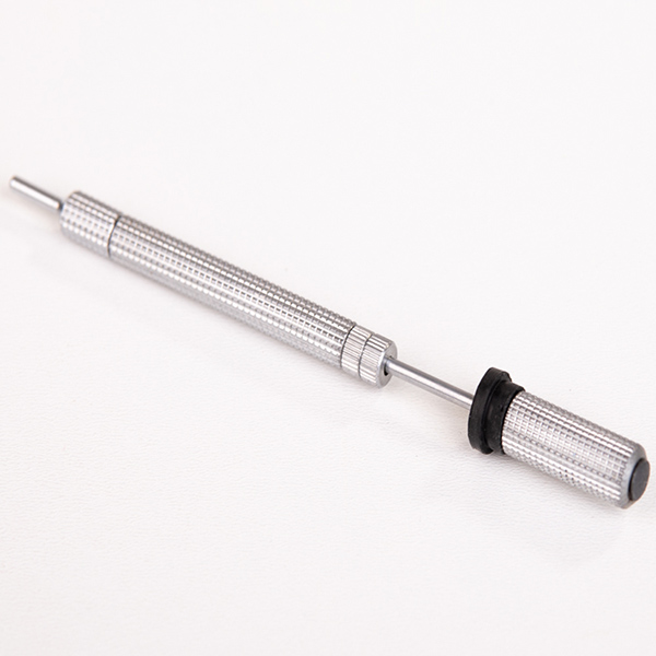 – Inserter se drži u vertikalnoj poziciji tako što je “teg” okrenut na gore, a izlaz igle na dole. Sa četiri prsta se drži telo insertera, a peti – kažiprst se postavlja ispod “tega” podignutog uvis za veličinu debljine kažiprsta.